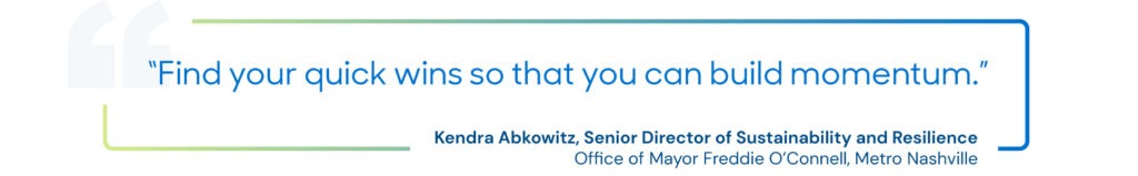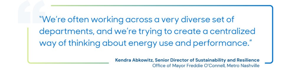 “We’re often working across a very diverse set of departments, and we’re trying to create a centralized way of thinking about energy use and performance,” explains Kendra Abkowitz, Senior Director of Sustainability and Resilience, Office of Mayor Freddie O’Connell, Metro Nashville.
