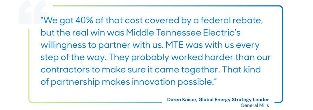 Daren Kaiser, Global Energy Strategy Leader for General Mills, says, “We got 40% of that cost covered by a federal rebate, but the real win was Middle Tennessee Electric’s willingness to partner with us. MTE was with us every step of the way. They probably worked harder than our contractors to make sure it came together. That kind of partnership makes innovation possible.”