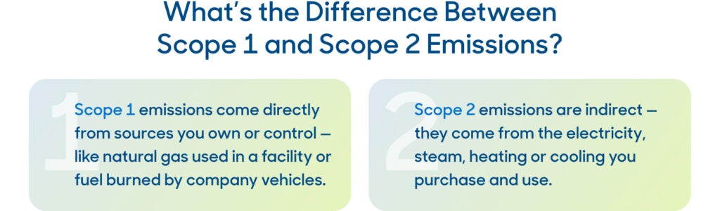 Think of Scope 1 as “on-site” emissions and Scope 2 as “purchased energy” emissions.