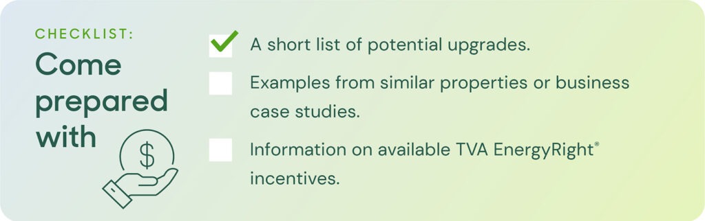 Even better: gather quick data on potential cost savings using tools like TVA EnergyRight’s incentive calculator. You can also note any performance issues like hot or cold spots, flickering lights, or equipment noise that support your case for improvements.