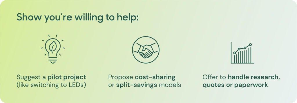 You don’t have to make the request and hope for the best — you can offer to be part of the solution. If you’re proposing larger upgrades, suggest starting small with a pilot project like retrofitting just one area with LED lighting. You can also propose a cost-sharing model or help by researching contractors, gathering quotes or completing incentive paperwork. This kind of proactive partnership can go a long way in showing your landlord that you’re serious and solution-oriented.