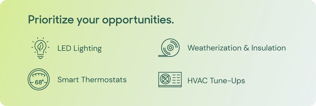 Before starting the conversation, take the time to identify specific upgrades or improvements that could make a significant impact in your space. Start with areas that offer high energy savings and fast paybacks, like:
