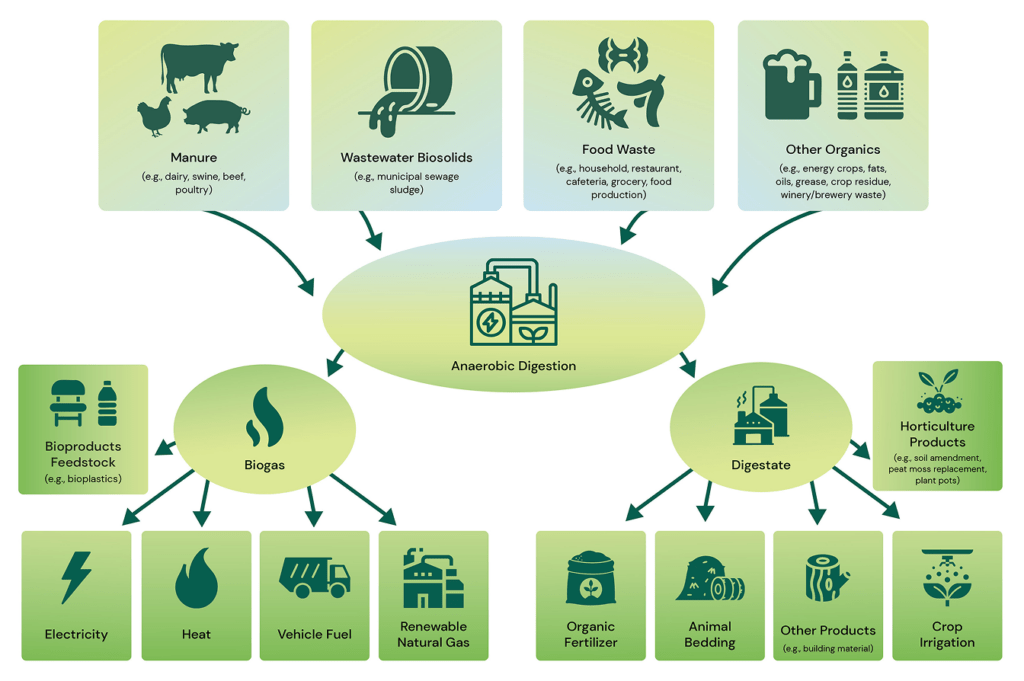 Anaerobic digesters are machines that break down food and plant waste using tiny microbes (like bacteria) that don’t need oxygen. As the microbes consume the waste, they produce a methane-rich gas, also known as biogas, which can be used to generate electricity.